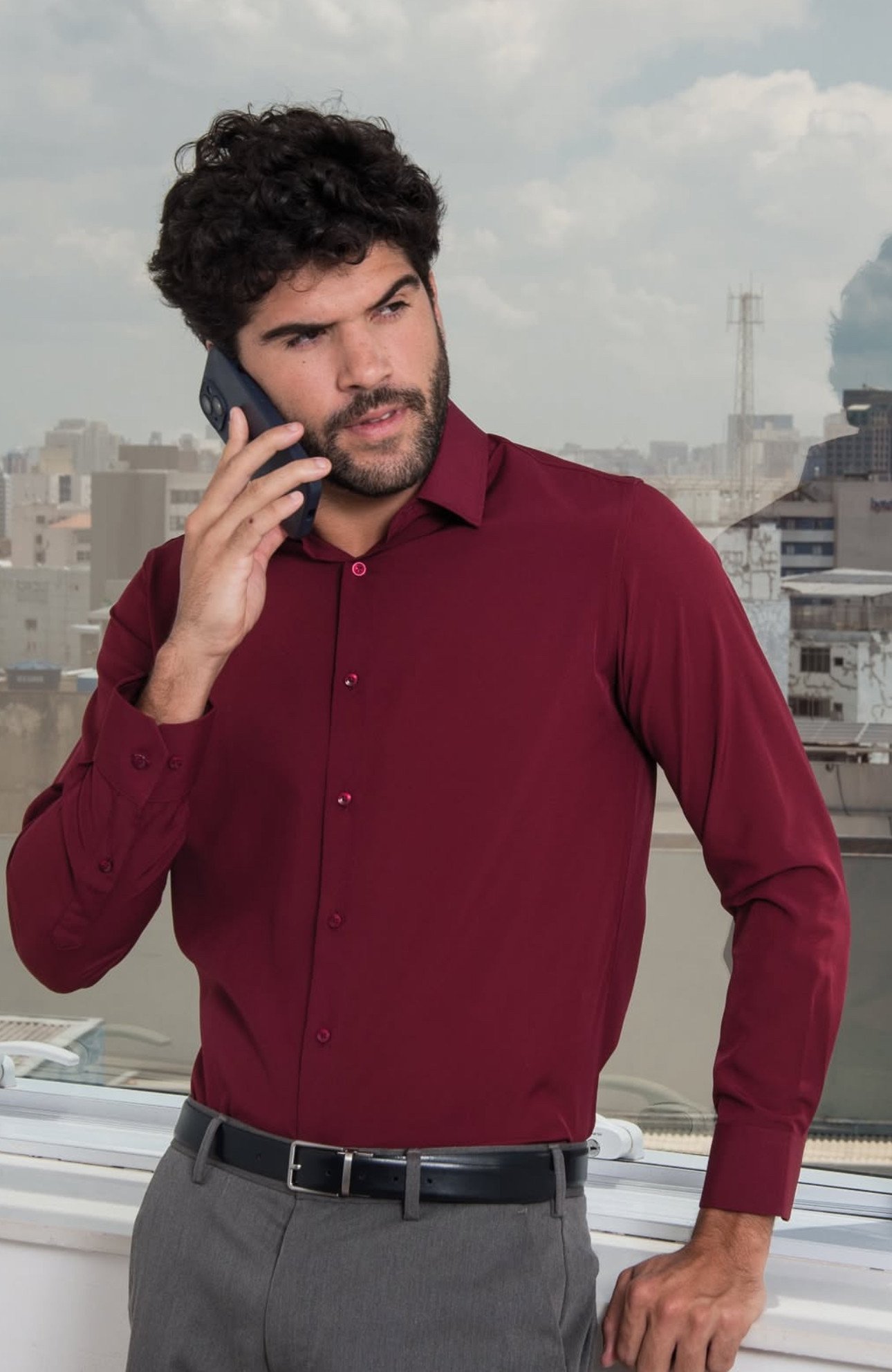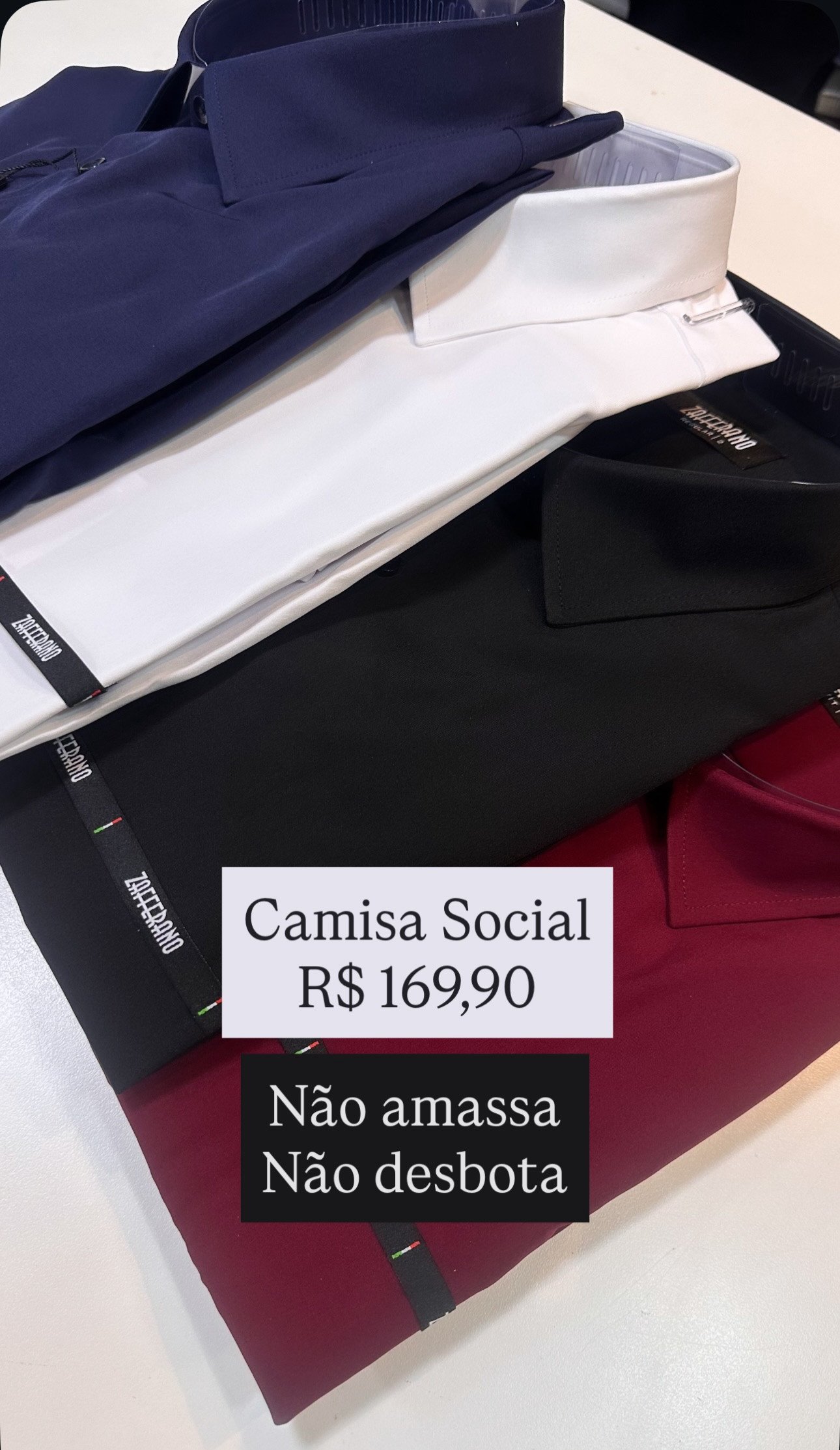 Camisa social poliéster e elastano. Não desbota, não amassa. Tem disponibilidade na modelagem regular ou Slim Fit.